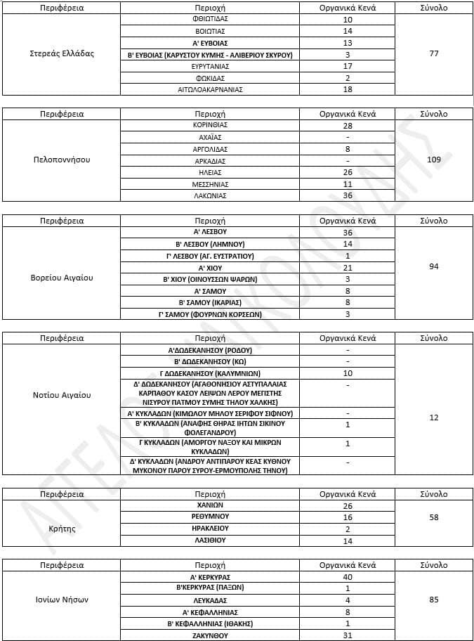 · Οι περιοχές Α’ & Β΄ Θεσσαλονίκης, Πιερίας, Καστοριάς, Λάρισας, Ιωαννίνων, Θεσπρωτίας, Δ’ Αθήνας, Αχαΐας, Αρκαδίας, Α’ Β’ & Δ’ Δωδεκανήσου, Α’ & Δ΄ Κυκλάδων δεν έχουν καθόλου οργανικά κενά.