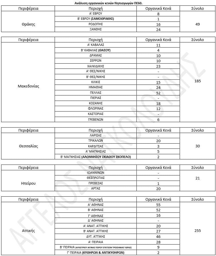 Τα οργανικά κενά Νηπιαγωγών ΠΕ60 (σύμφωνα με την εγκύκλιο μετατάξεων) είναι 975. Σύμφωνα με τις πληροφορίες η κατανομή για διορισμούς θα περιλαμβάνει πιθανότατα όλα τα οργανικά των Νηπιαγωγών. Επιχειρήθηκε μια ανάλυση των συνολικών οργανικών κενών, ώστε να υπάρχει μια γενική εικόνα των κενών. Κάτι αντίστοιχο θα γίνει, όταν βγει η τελική κατανομή από το υπουργείο.