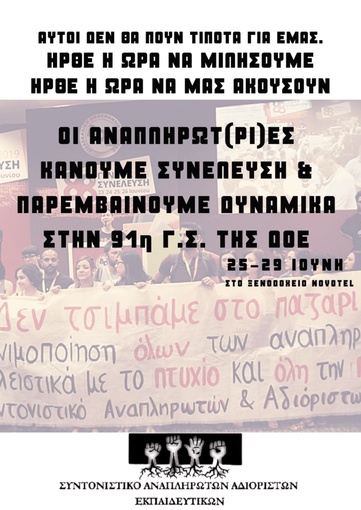 Παρόλα αυτά επειδή την Κυριακή ξεκινάει το συνέδριο της ΔΟΕ και επειδή χωρίς την ομοσπονδία είναι πολύ δύσκολο να αντιπαλεύεις την αντιεκπαιδευτική πολιτική, είδαμε ότι το συντονιστικό αναπληρωτών καλεί τους αναπληρωτές σε παράσταση διαμαρτυρίας μέσα στη Γ.Σ. της ΔΟΕ…