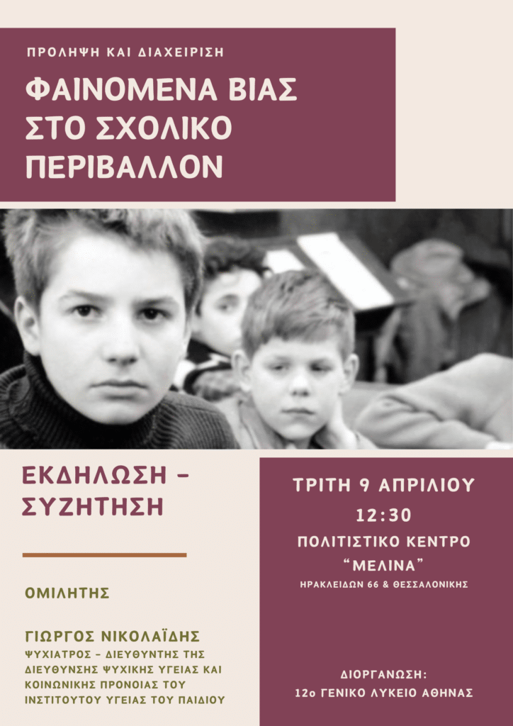 Το 12ο Γενικό Λύκειο Αθηνών διοργανώνει μια σημαντική εκδήλωση με θέμα τα φαινόμενα βίας στο σχολικό περιβάλλον. Η εκδήλωση θα περιλαμβάνει μια ζωντανή συζήτηση, με κύριο ομιλητή τον κ. Γ. Νικολαΐδη, ψυχίατρο και Διευθυντή της Διεύθυνσης Ψυχικής Υγείας & Κοινωνικής Πρόνοιας του Ινστιτούτου Υγείας του Παιδιού. Σκοπός της εκδήλωσης είναι να αναδειχθούν τα προβλήματα και οι προκλήσεις που σχετίζονται με τη βία στο σχολικό περιβάλλον, καθώς και να ευαισθητοποιηθεί ο κοινός για το θέμα. Η εκδήλωση θα πραγματοποιηθεί στο Πολιτιστικό Κέντρο “Μελίνα” του Δήμου Αθηναίων, την Τρίτη 9 Απριλίου 2024, στις 12:30 το μεσημέρι. Είναι μια ευκαιρία για όλους να συμμετάσχουν και να συμβάλουν στον διάλογο για ένα πιο ασφαλές και υγιές σχολικό περιβάλλον.