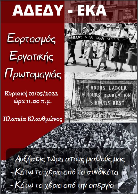 Επίσης η ΑΔΕΔΥ αναφέρει: «Η Εκτελεστική Επιτροπή της Α.Δ.Ε.Δ.Υ. σας καλεί στη συγκέντρωση των συνδικάτων (ΑΔΕΔΥ-ΕΚΑ) την Κυριακή, 1η του Μάη 2022, ώρα 11:00πμ, στην Πλατεία Κλαυθμώνος. Θα ακολουθήσει πορεία προς τη Βουλή».
