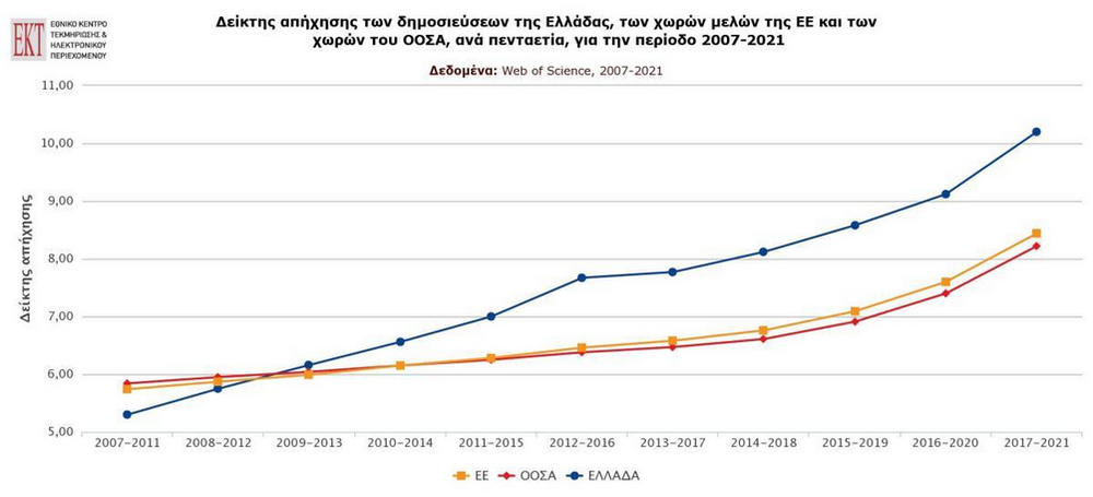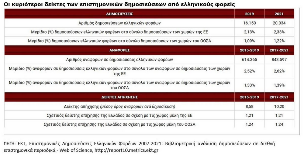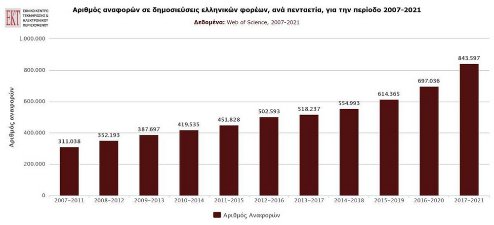 Εικόνα 4: Στοιχεία ποιότητας και πλήθους του παραγόμενου ερευνητικού έργου από ελληνικούς φορείς, κατά πλειοψηφία από ΑΕΙ και δημόσιους ερευνητικούς οργανισμούς.