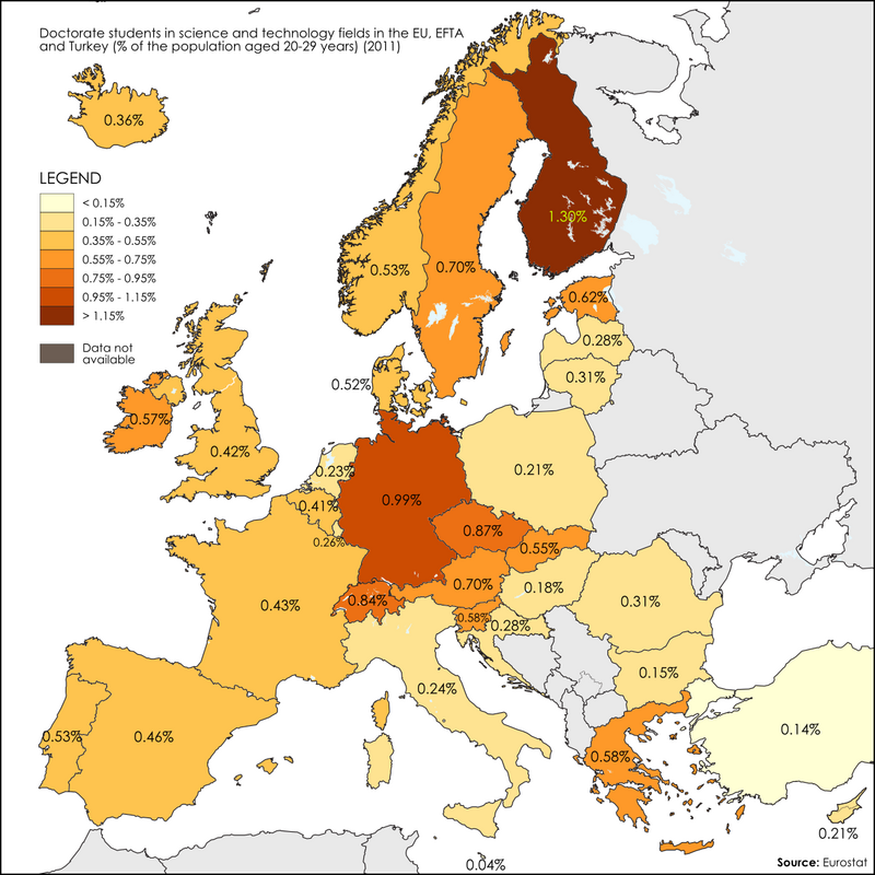 Εικόνα 2: Ποσοστό κατόχων διδακτορικού (PhD) ως προς το σύνολο του πληθυσμού.