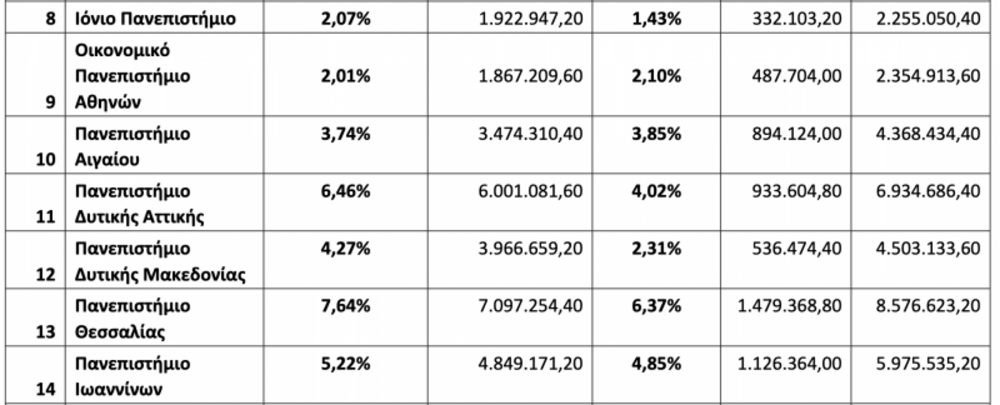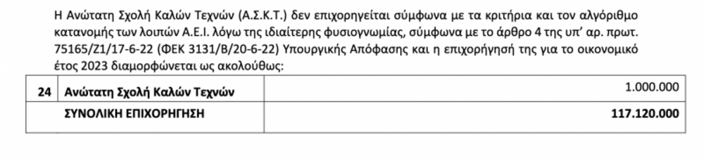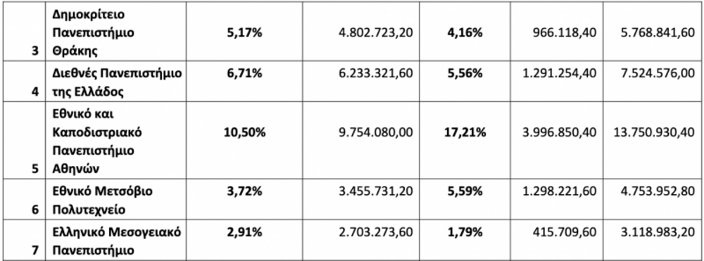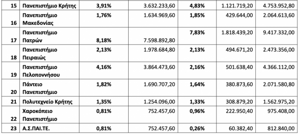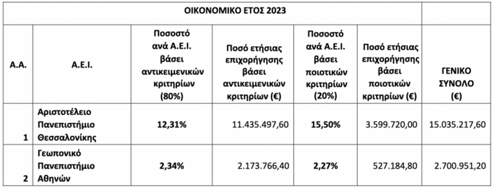 Πίνακας 5: Κατανομή χρηματοδότησης των ΑΕΙ από τον κρατικό προϋπολογισμό (2023), συνολικού ύψους 117,12 εκατομμύρια ευρώ.