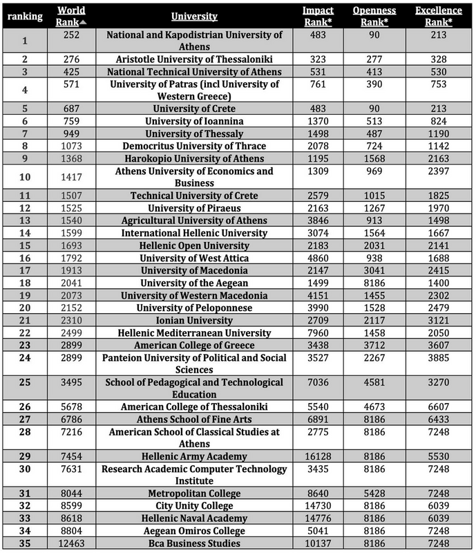 Πίνακας 3: Διεθνής κατάταξη των ακαδημαϊκών ιδρυμάτων ανώτατου επιπέδου που λειτουργούν στην Ελλάδα ως ΑΕΙ ή ιδιωτικά εκπαιδευτήρια συνεργαζόμενα με ξένους φορείς (Πηγή: Webometrics, Αυγ.2023 – http://www.webometrics.info/en/Europe/Greece%20)