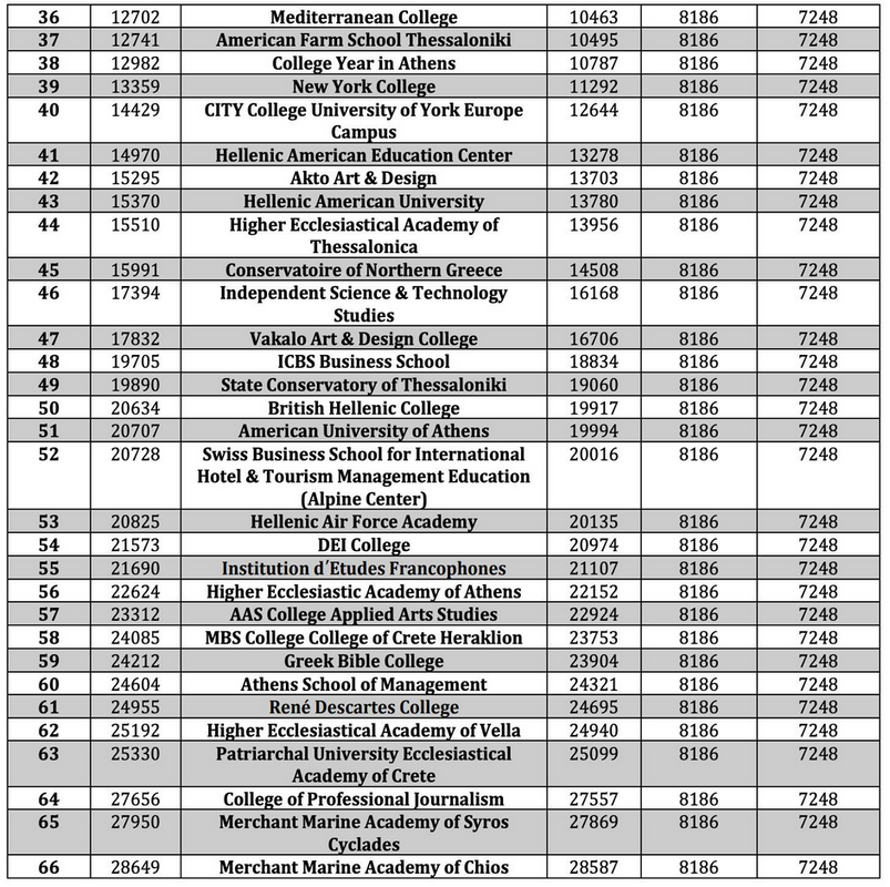 - Σε επίπεδο ακαδημαϊκής αριστείας, σύμφωνα με τους διεθνείς δείκτες αξιολόγησης τα μεγάλα δημόσια ΑΕΙ βρίσκονται σταθερά στο κορυφαίο 3% παγκοσμίως στην κατάταξη των καλύτερων 12.000 ιδρυμάτων διεθνώς, ενώ αντίθετα όλα τα υφιστάμενα ιδιωτικά εκπαιδευτήρια απονομής ξένων τίτλων σπουδών ανάλογου επιπέδου (π.χ. Bachelor – BSc) στην Ελλάδα βρίσκονται σταθερά στις θέσεις από 8.000 και κάτω (βλ. παρακάτω Πίνακες 3-4). Είναι χαρακτηριστικό ότι από τους 36 τέτοιους αδειοδοτημένους από το Υπουργείο Παιδείας ιδιωτικούς φορείς, μόλις 8 έχουν καταφέρει να συμπεριληφθούν έστω μία φορά στη διεθνή λίστα των καλύτερων 12.000 ιδρυμάτων στην περίοδο 2013-2023.