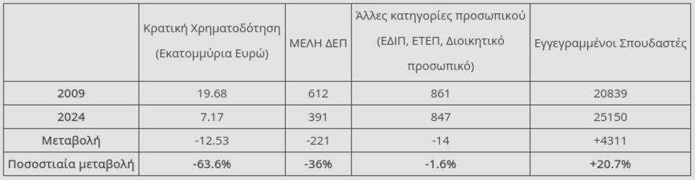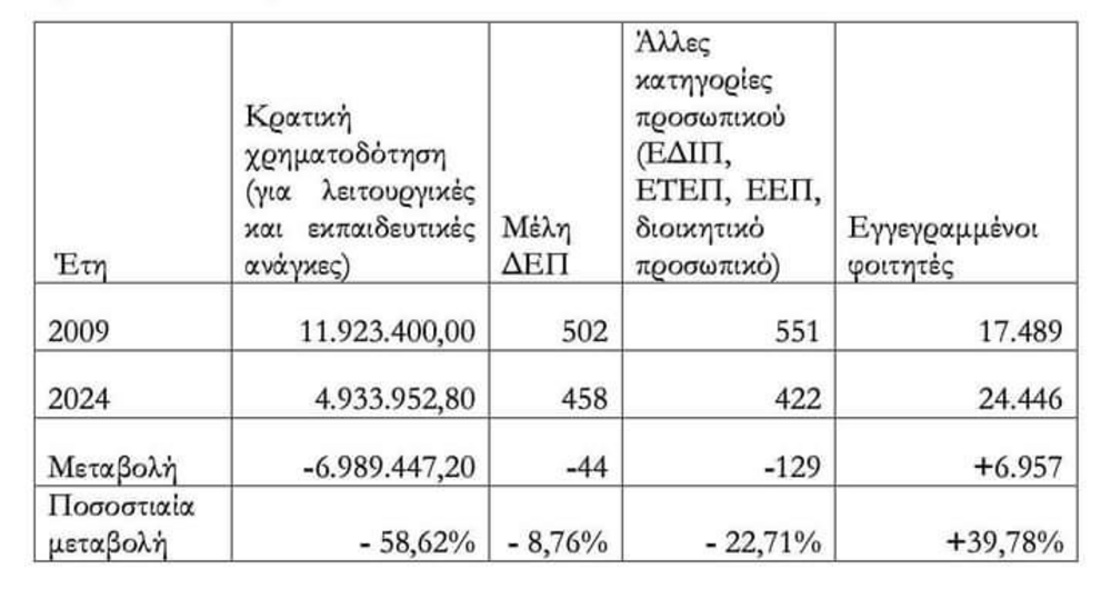 Παρακάτω παρατίθενται ενδεικτικά μερικά επίσημα οικονομικά στοιχεία, δημοσιευμένα από το Εθνικό Μετσόβιο Πολυτεχνείο (ΕΜΠ) (Πίνακας 1) και το Πανεπιστήμιο Κρήτης (Πίνακας 2). Από αυτά αποδεικνύεται αδιαμφισβήτητα η ραγδαία απο-χρηματοδότηση των ΑΕΙ συστηματικά τα τελευταία 15 χρόνια, μέσω συρρίκνωσης του προϋπολογισμού τους στο σχεδόν 1/3 και ταυτόχρονα αύξηση των φοιτητών σε αυτά κατά +20% ως +40%.
