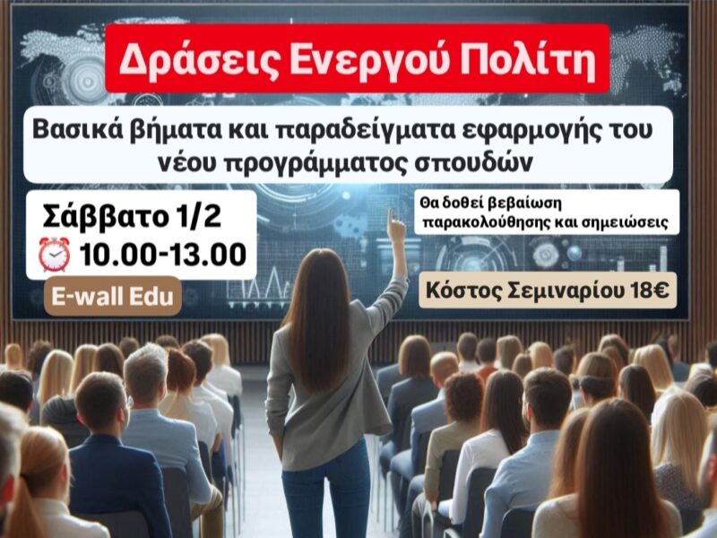 Το Webinar δίνει τη δυνατότητα σε κάθε ενδιαφερόμενο, μέσα από βασικά βήματα και παραδείγματα εφαρμογής , να σχηματίσει μια ολοκληρωμένη εικόνα για το νέο Πρόγραμμα Σπουδών σύμφωνα με το ΦΕΚ Β 6048/01/11/2024: Δράσεις Ενεργού Πολίτη του Νηπιαγωγείου, του Δημοτικού, του Γυμνασίου και του Λυκείου. Την επιμέλεια και παρουσίαση του σεμιναρίου έχει εκπαιδευτικός με πολυετή εμπειρία … Συνεχίστε να διαβάζετε το WEBINAR Δράσεις Ενεργού Πολίτη: Βασικά βήματα και παραδείγματα εφαρμογής του προγράμματος σπουδών.