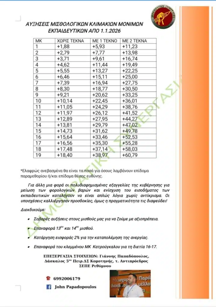 Οι αυξήσεις στα μισθολογικά κλιμάκια των μόνιμων εκπαιδευτικών από 1/1/2026 είναι ελάχιστες και δεν ανταποκρίνονται ούτε στο αυξημένο κόστος ζωής ούτε στη συνεχή οικονομική αφαίμαξη των τελευταίων ετών. Πρόκειται για αυξήσεις που, στην πράξη, δεν καλύπτουν ούτε στοιχειώδεις ανάγκες, ενώ η αγοραστική δύναμη των εκπαιδευτικών συνεχίζει να συρρικνώνεται.