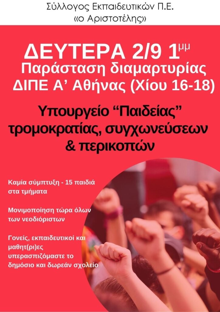 Σύλλογος Εκπαιδευτικών “ο Αριστοτέλης”: Κινητοποίηση όλων των συλλόγων της Α’ Αθήνας Δευτέρα 2/9 στη 1μμ στην ΔΙΠΕ Α’ Αθήνας (Χίου 16-18) για την άμεση μονιμοποίηση ΟΛΩΝ των νεοδιόριστων και τις συμπτύξεις τμημάτων.
