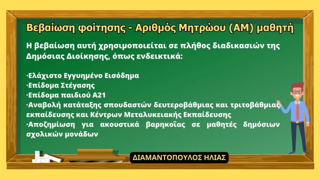 Για τον παραπάνω λόγο μπορούν να απευθυνθούν στη σχολική μονάδα όπου φοιτούν τα παιδιά τους και να ζητήσουν τον ΑΜ ή πολύ απλά να εκδώσουν οι ίδιοι, μέσω gov.gr και με κωδικούς ΤaxisΝet, «Βεβαίωση Φοίτησης Μαθητή/τριας» στην οποία φαίνεται ο ΑΜ του μαθητή. Η διαδικασία για την έκδοση της βεβαίωσης είναι πολύ απλή.