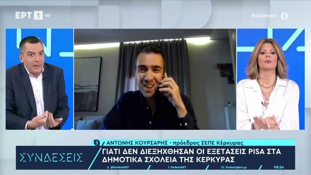 Στο πλαίσιο αυτό, αποδεχόμενος την πρόσκληση, βρέθηκε καλεσμένος στην πρωινή εκπομπή της ΕΡΤ1 «Συνδέσεις» ο συνάδελφός μας και πρόεδρος του ΣΕΠΕ Κέρκυρας Κουρσάρης Αντώνης για να παρουσιάσει τις απόψεις των εκπαιδευτικών σχετικά με τις εξετάσεις PISA στο δημοτικό σχολείο και την καθολική απόφαση των εκπαιδευτικών των 5 σχολείων της Κέρκυρας να τις ακυρώσουν.