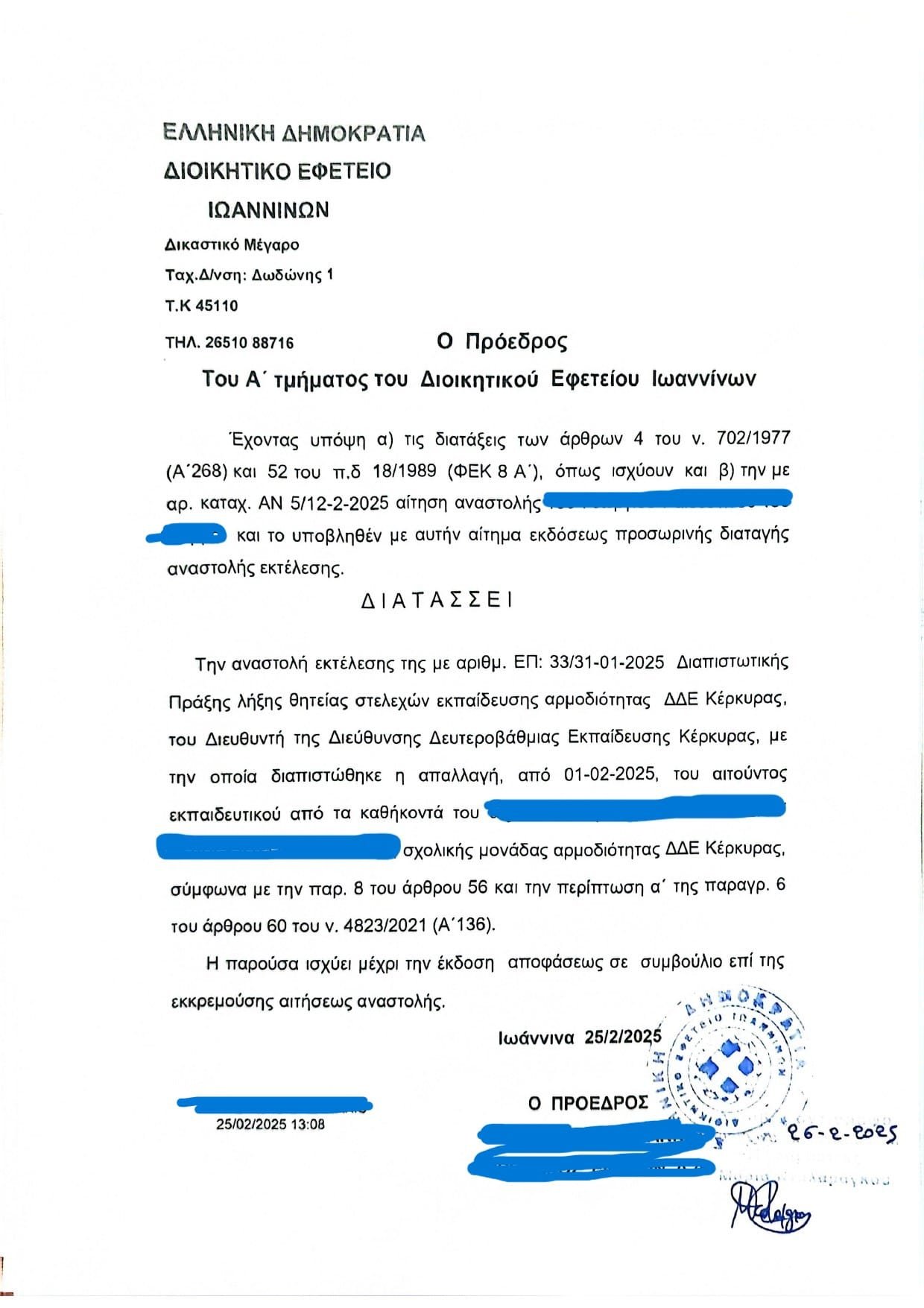 Νέα σφαλιάρα στην πολιτική στοχοποίησης και διώξεων εκπαιδευτικών που ακολουθεί η πολιτική ηγεσία του υπουργείου παιδείας. Για άλλη μια φορά η δικαιοσύνη εγκαλεί τις υπηρεσίες του ΥΠΑΙΘΑ για την νομιμότητα των πράξεων τους. Συγκεκριμένα το διοικητικό εφετείο Ιωαννίνων ανέστειλε την εκτέλεση της παύσης διευθυντων/ντριων, υποδιευθυντων/ντριων που συμμετέχουν στην Απεργία/Αποχή και την οποία παύση είχε αποφασίσει η ΔΙΔΕ Κέρκυρας. Δείτε:
