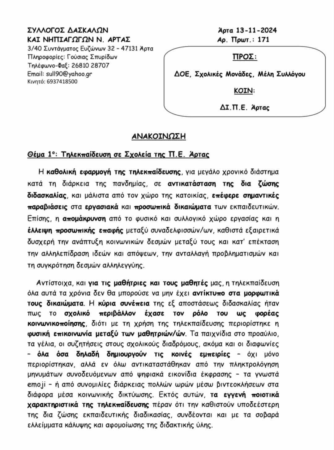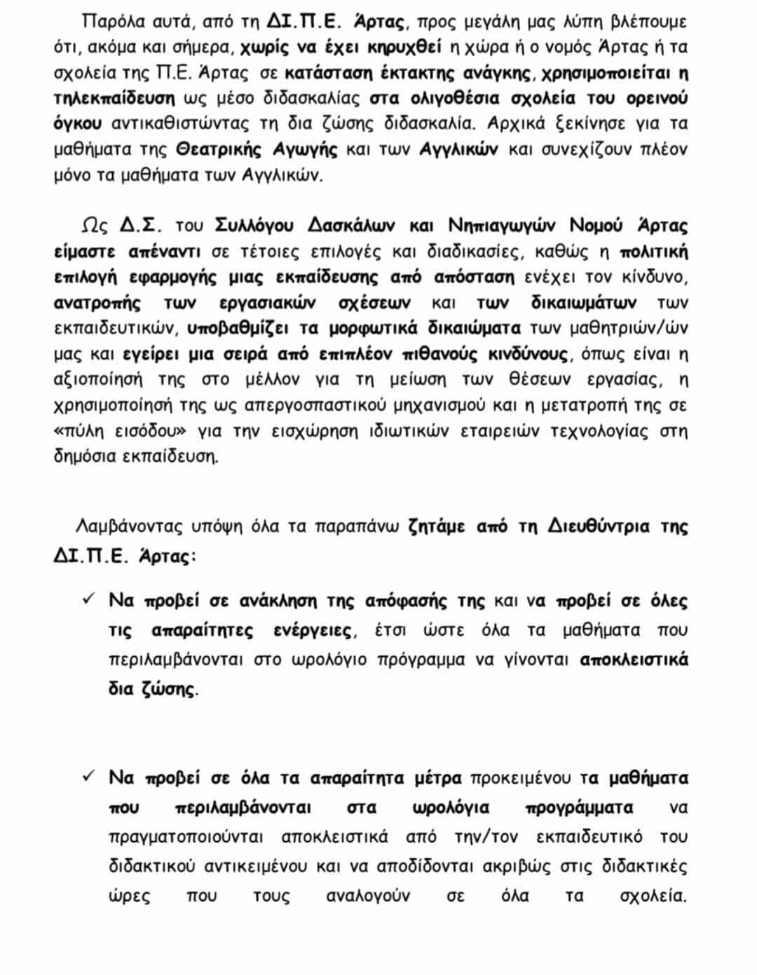Το νέο κόλπο για εξοικονόμηση του Υπουργείου παιδείας φαίνεται ότι εφαρμόζεται όλο και περισσότερο ανά την Ελλάδα. Τελικά δεν ήταν μόνο τα έρημα νησιά όπως λεγόταν κάποτε, είναι και η ηπειρωτική Ελλάδα και ποιος ξέρει που μπορεί να φτάσει η υποβάθμιση των μορφωτικών ευκαιριών των μαθητών, μέσω της κατάργησης της ίδιας της φυσικής σχολικής τάξης. Δείτε την ανακοίνωση του συλλόγου εκπαιδευτικών Άρτας: