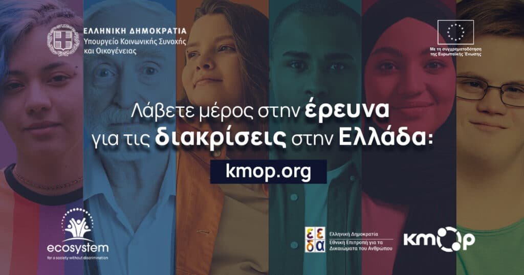 Στο πλαίσιο του ευρωπαϊκού έργου «ECOSYSTEM», διεξάγεται η πανελλαδική έρευνα του ΚΜΟΠ με θέμα τις στάσεις και εμπειρίες των πολιτών απέναντι στις διακρίσεις και τα στερεότυπα. Η έρευνα, που πραγματοποιείται με τη συνεργασία του Υπουργείου Κοινωνικής Συνοχής και Οικογένειας και της Εθνικής Επιτροπής για τα Δικαιώματα του Ανθρώπου, στοχεύει στη διαμόρφωση του 2ου Εθνικού Σχεδίου Δράσης κατά του Ρατσισμού, στη δημιουργία μιας πλατφόρμας υποστήριξης θυμάτων διακρίσεων και στην ενίσχυση της κοινωνικής ισότητας. Οι πολίτες καλούνται να συμμετάσχουν ανώνυμα, συμβάλλοντας έτσι στην καταγραφή των επιπτώσεων των διακρίσεων και στην προώθηση δράσεων καταπολέμησης της μισαλλοδοξίας.