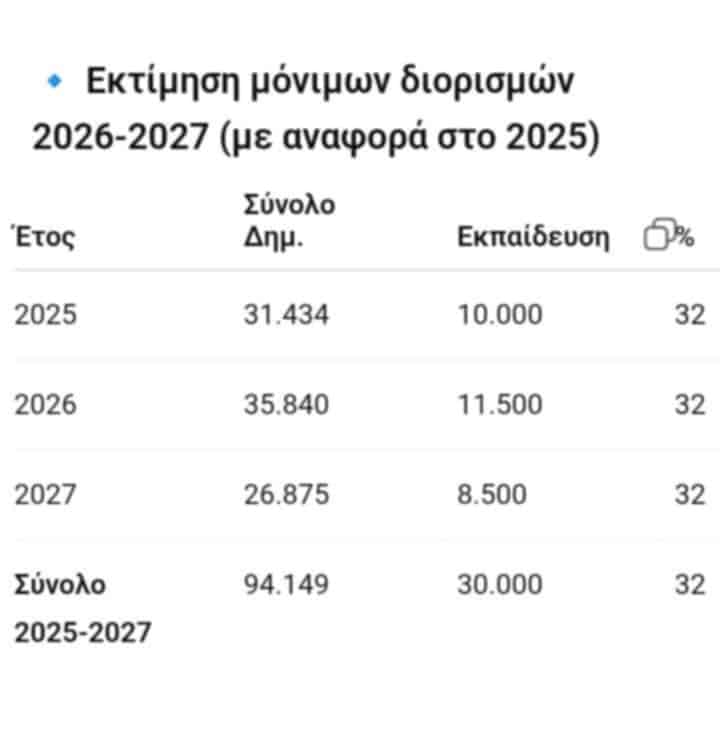 Συνολικά, για την τριετία 2025–2027 εκτιμώνται περίπου 30.000 διορισμοί στην Εκπαίδευση, ενώ οι συνολικοί διορισμοί στο Δημόσιο φτάνουν τους 94.149.