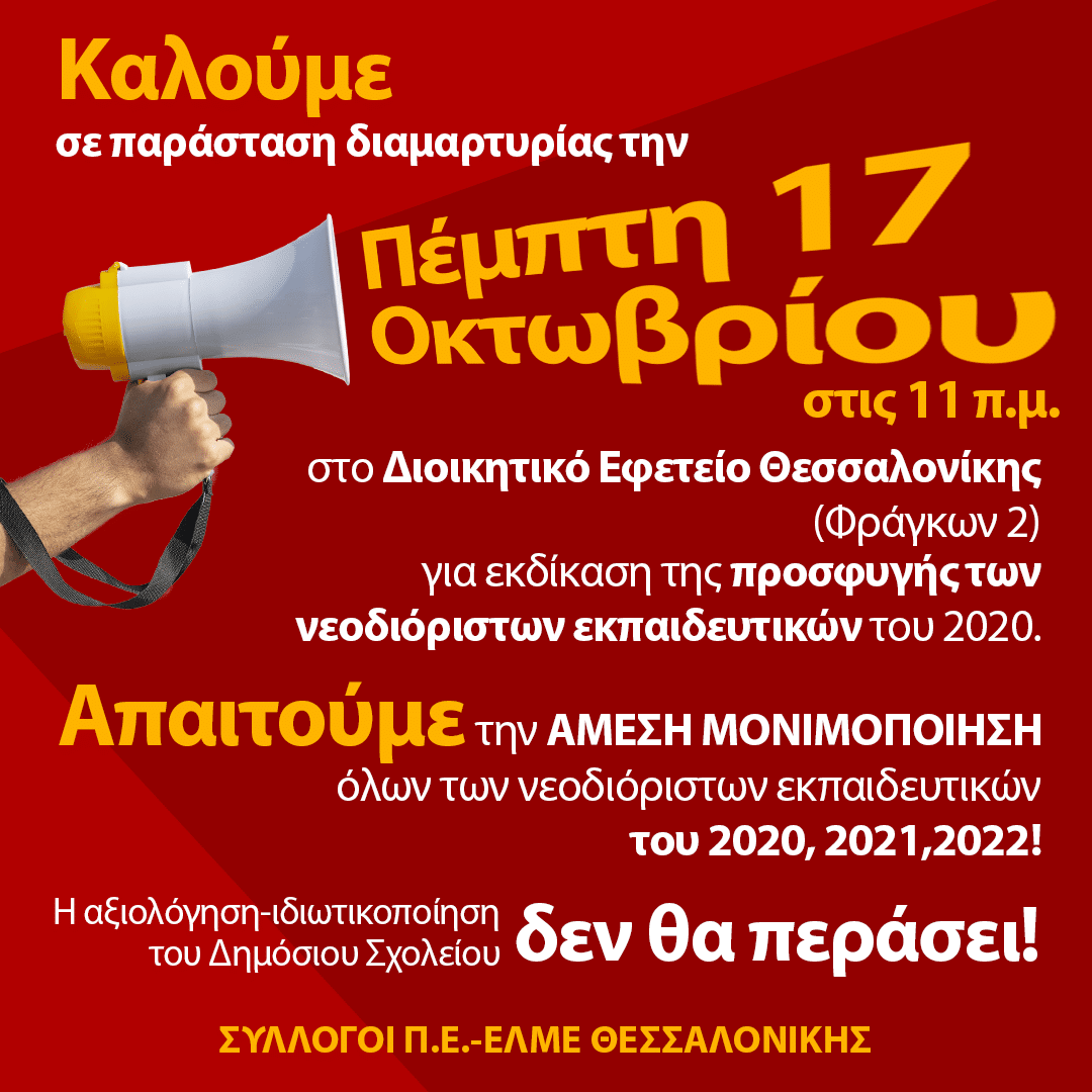 Τα εκπαιδευτικά σωματεία της Θεσσαλονίκης καλούν τους/τις νεοδιόριστους/ες και όλους/ες τους/τις εκπαιδευτικούς σε συγκέντρωση την Πέμπτη 17 Οκτωβρίου, στις 11π.μ., στο Διοικητικό Εφετείο Θεσσαλονίκης (Φράγκων 2). Για τη διευκόλυνση της συμμετοχής στη συγκέντρωση κηρύσσουμε 3ωρη στάση εργασίας (3 τελευταίες ώρες του διδακτικού ωραρίου).