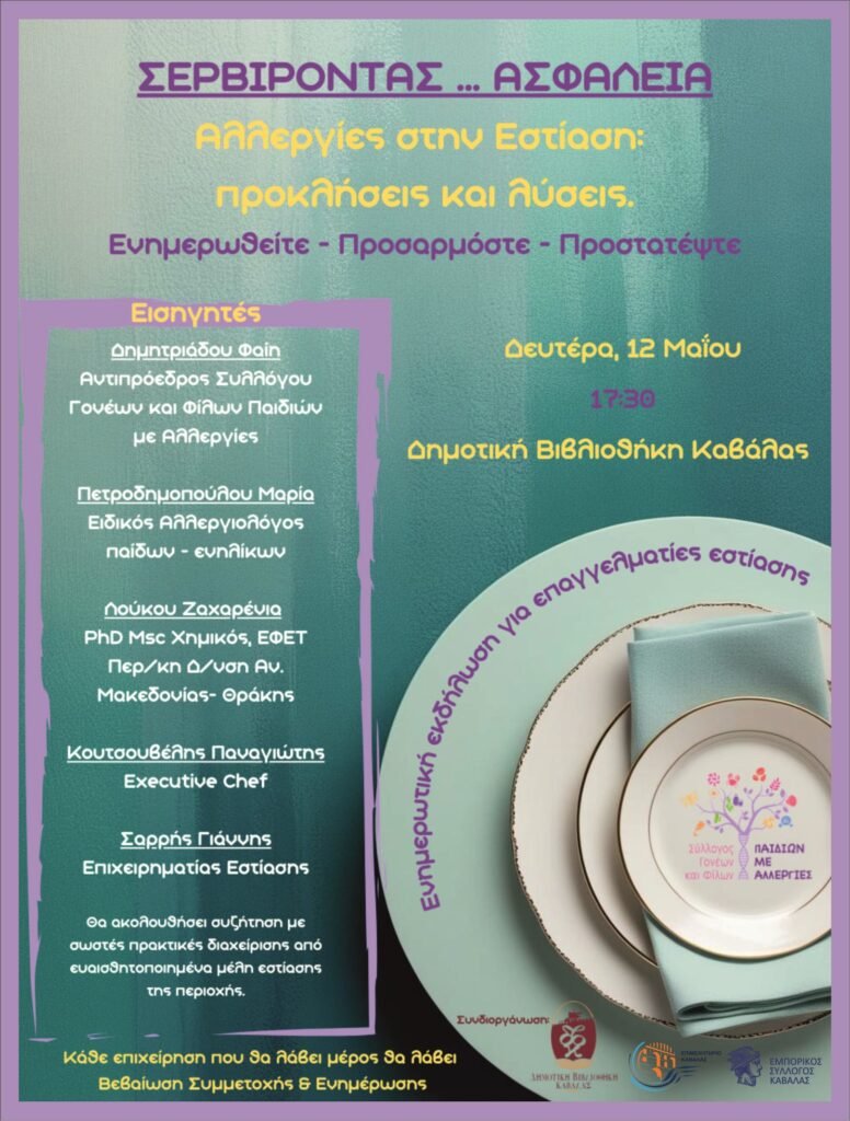 Με μεγάλη χαρά, ο Πανελλήνιος Σύλλογος Γονέων και Φίλων Παιδιών με Αλλεργίες ανακοινώνει την πρώτη πανελλαδικά ενημερωτική εκδήλωση με θέμα τις τροφικές αλλεργίες στον τομέα της εστίασης.