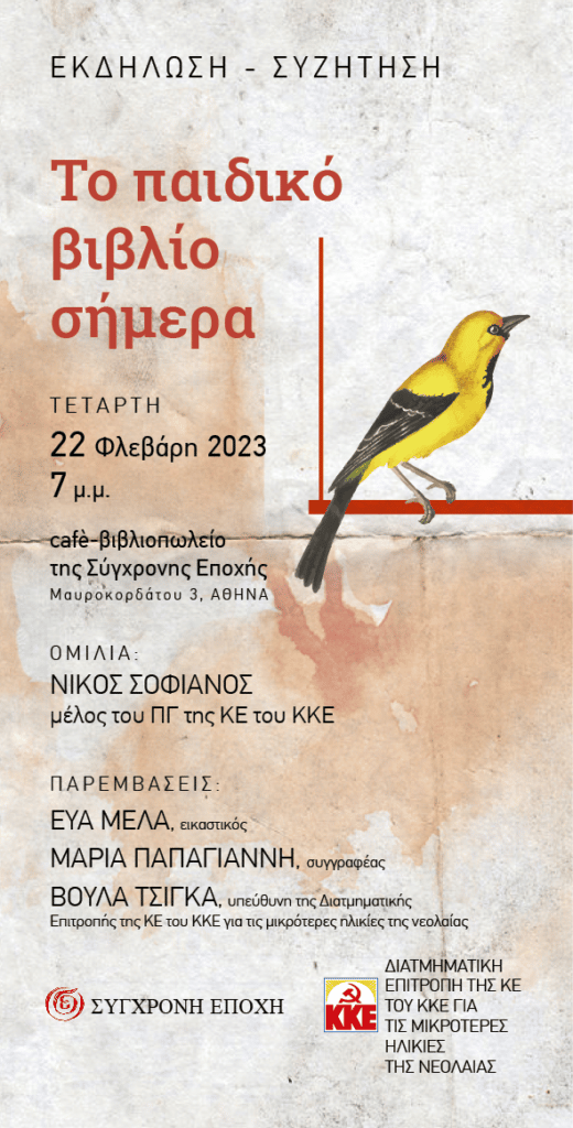 Η διατμηματική επιτροπή της ΚΕ του ΚΚΕ για τις μικρότερες ηλικίες της νεολαίας και οι εκδόσεις Σύγχρονη Εποχή καλούν σε εκδήλωση – συζήτηση με θέμα: «Το παιδικό βιβλίο σήμερα», την Τετάρτη 22 Φλεβάρη 2023, στις 19.00, στο βιβλιοπωλείο της Σύγχρονης Εποχής (Μαυροκορδάτου 3, Αθήνα).