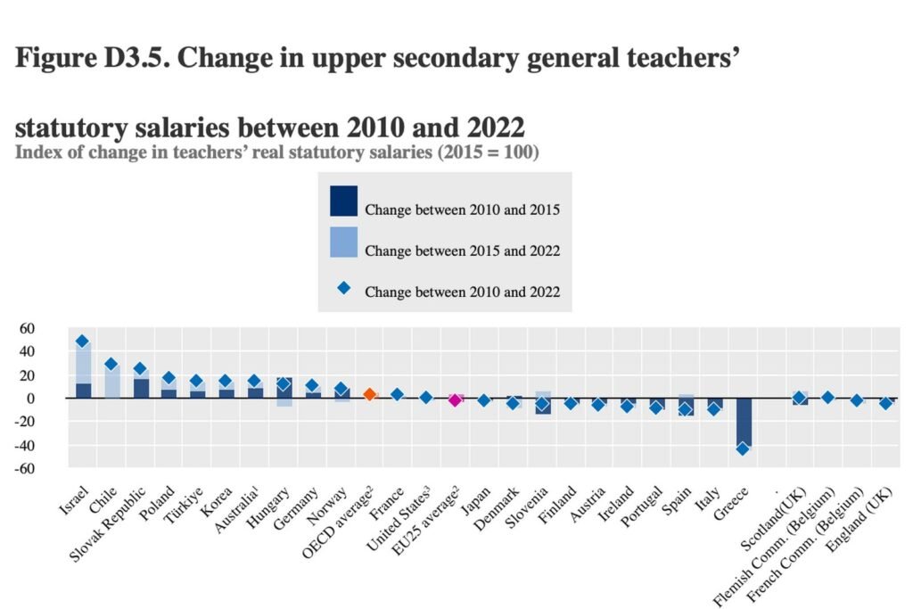 Σύμφωνα με τα στοιχεία του ΟΟΣΑ, η Ελλάδα κατέχει το θλιβερό ρεκόρ της χώρας με τις μεγαλύτερες μειώσεις στους μισθούς των εκπαιδευτικών, οι οποίοι έχουν υποστεί περικοπές άνω του 30% την τελευταία δεκαετία (2010-2022).