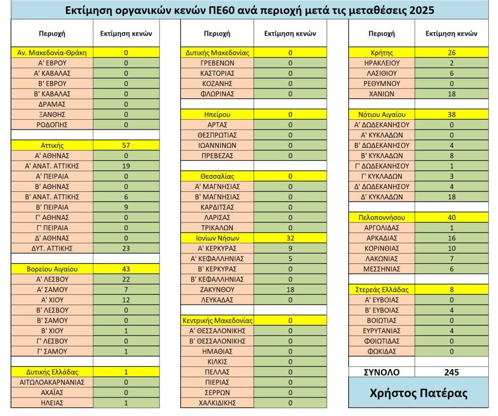Η παρούσα ανάλυση έγινε από τον Χρήστο Πατέρα και αφορά την εκτίμηση των οργανικών κενών των Νηπιαγωγών (ΠΕ60) σε όλη την Ελλάδα μετά τις μεταθέσεις του 2025.