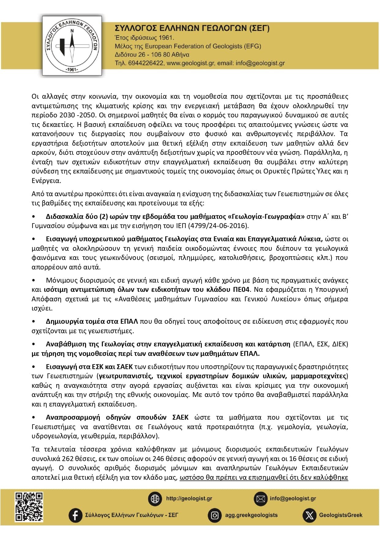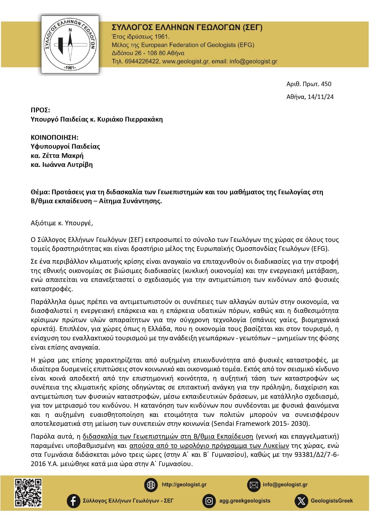 Ακολουθεί η επιστολή του ΣΕΓ προς τον Υπουργό Παιδείας, αναφορικά με την Γεωλογία στην εκπαίδευση καθώς και τις μηδενικές προσλήψεις αναπληρωτών γεωλόγων φέτος.