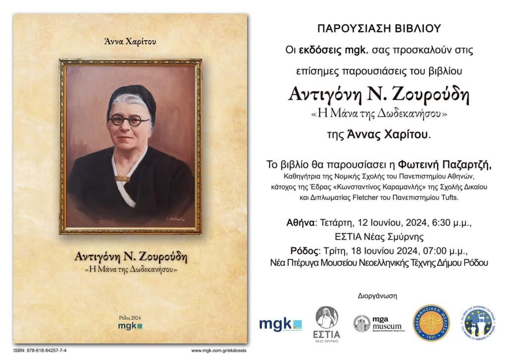Την Τετάρτη, 12 Ιουνίου 2024, θα παρουσιαστεί στην Αίθουσα «Πάνος Χαλδέζος» της Εστίας Νέας Σμύρνης (Κωνσταντίνου Παλαιολόγου 1, Νέα Σμύρνη, Αττική), το βιβλίο «Αντιγόνη Ν. Ζουρούδη – Η Μάνα της Δωδεκανήσου» της Άννας Χαρίτου-Ανδριωτάκη, στις 18:30.