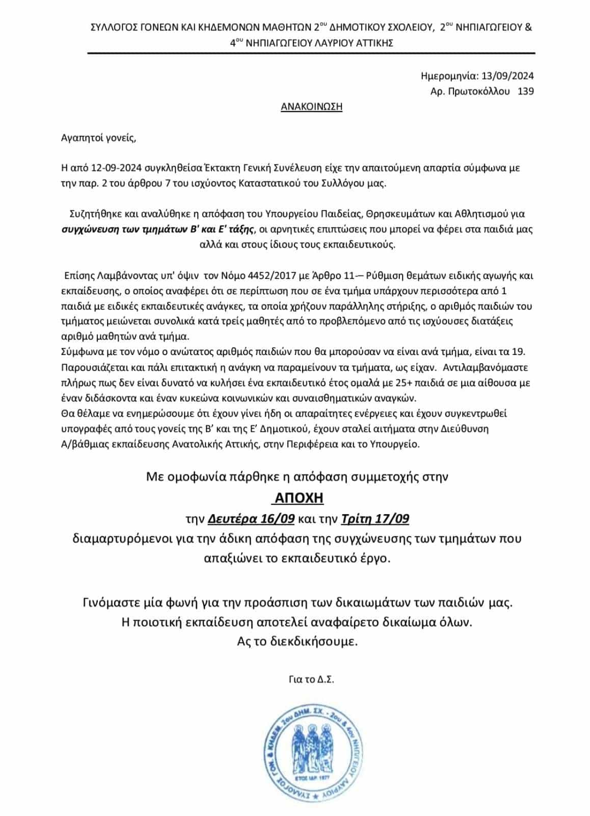 Με συντριπτική συμμετοχή στην αποχή των μαθητών και στάση εργασίας εκπαιδευτικών το 4ο ΔΣ Μαρκοπούλου ΔΕΝ ξεκίνησε τα μαθήματα. ΑΠΟΧΗ ΔΙΑΡΚΕΙΑΣ αποφάσισαν οι γονείς. # Έως 2ώρες σταση εργασίας από της 8πμ για τους εκπαιδευτικούς του σχολείου για 13/9/2024