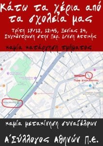 Καλούμε σε μαζική συμμετοχή στην κινητοποίηση την Τρίτη 17/12/2024 και ώρα 12.45 στην Περιφερειακή Διεύθυνση Εκπαίδευσης Αττικής, Ξενίας 24. Στην κινητοποίηση έχουν ήδη αποφασίσει τη συμμετοχή τους η Ένωση Γονέων Ζωγράφου και ο Σύλλογος Γονέων του 8ου Δημοτικού Σχολείου Ζωγράφου. Καλούμε το ΔΣ της ΔΟΕ, τους όμορους Συλλόγους ΠΕ και τις ΕΛΜΕ, τους γονεϊκούς φορείς του Δήμου Αθηναίων να συμμετέχουν στην κινητοποίηση.
