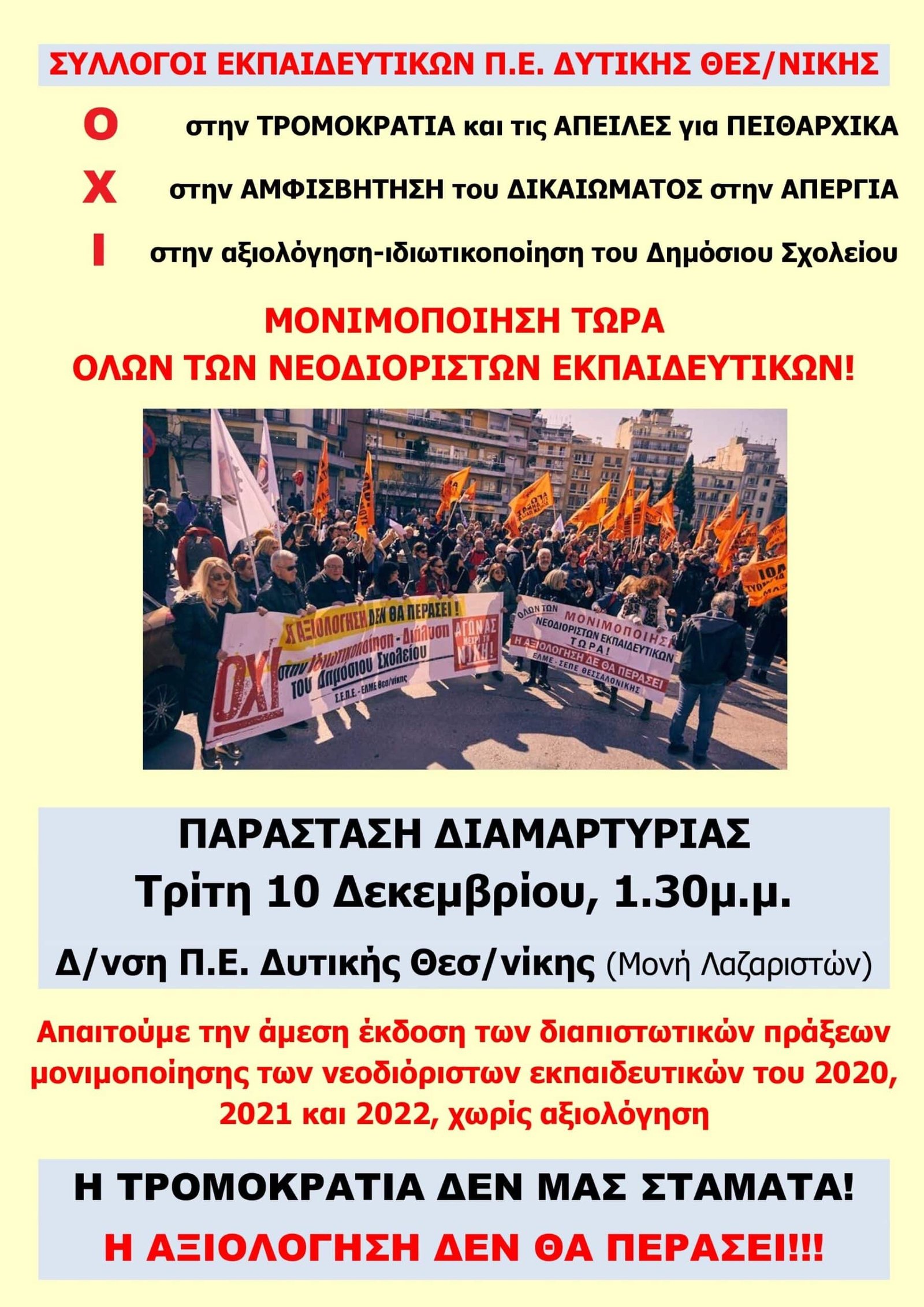 - Καλούμε όλους/ες τους/τις εκπαιδευτικούς να συμμετέχουν στην παράσταση διαμαρτυρίας στη Δ/νση Π.Ε. Δυτικής Θεσσαλονίκης, την Τρίτη 10 Δεκεμβρίου, 1.30μ.μ.
