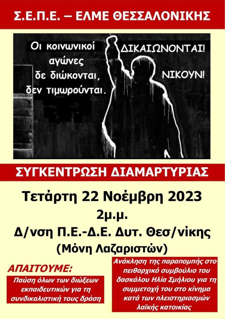 Συγκέντρωση Διαμαρτυρίας της Τετάρτη 22 Νοέμβρη, στις 2μ.μ., στη Διεύθυνση Π.Ε. Δυτικής Θεσσαλονίκης ενάντια στην την πειθαρχική δίωξη του εκπαιδευτικού Ηλία Σμήλιου