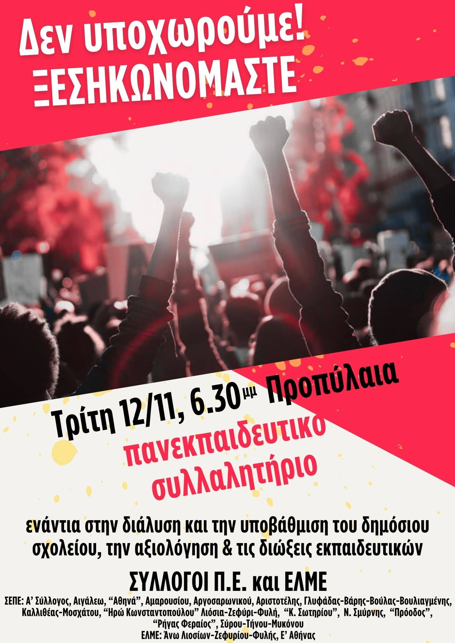 Τρίτη 12 Νοέμβρη, 18:30, πανεκπαιδευτικό συλλαλητήριο, Προπύλαια