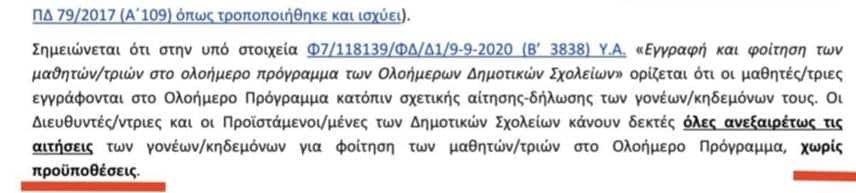 Κανείς γονέας δεν είναι υποχρεωμένος να φέρει δικαιολογητικά για να εγγράψει το παιδί του και επομένως αν δεν τα προσκομίσει κανείς δεν έχει δικαίωμα να αποκλείσει το παιδί του από το ολοήμερο. Αυτό οφείλουν όλοι οι εκπαιδευτικοί και ιδιαίτερα οι προϊστάμενοι/ες/διευθυντές/ντριες των σχολείων να το λάβουν υπόψιν τους.