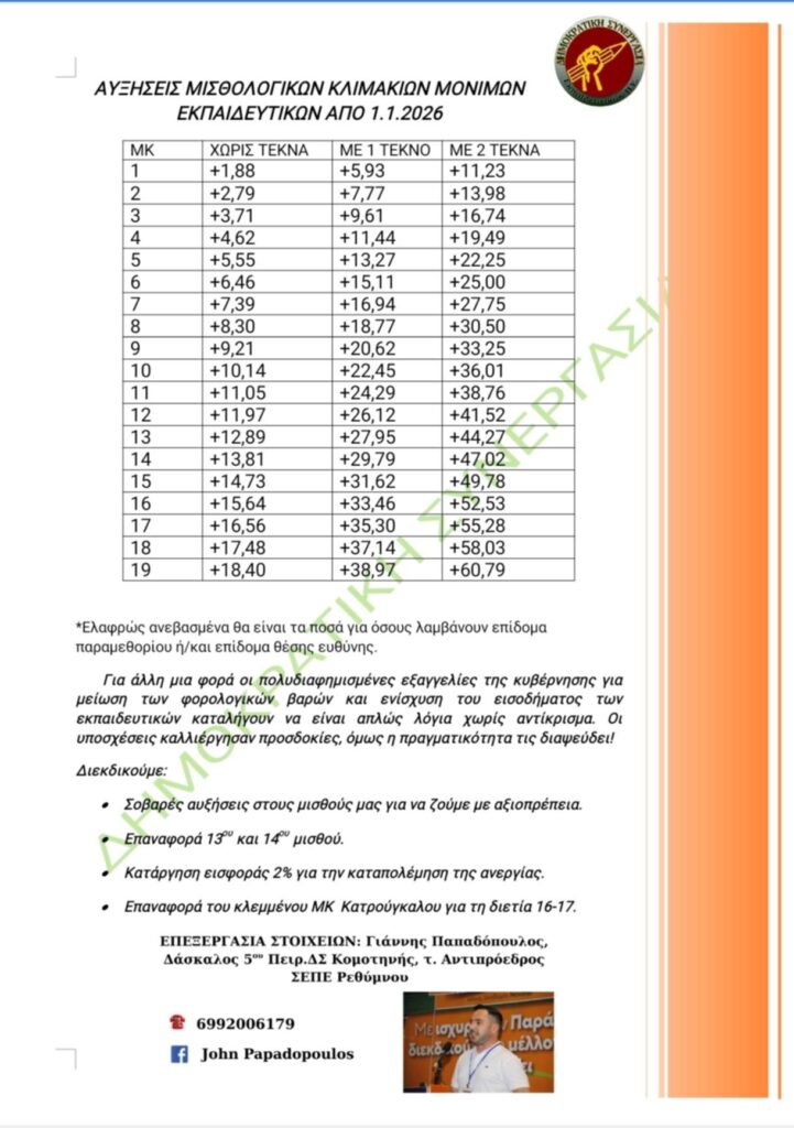 Οι αυξήσεις στα μισθολογικά κλιμάκια των μόνιμων εκπαιδευτικών από 1/1/2026 είναι ελάχιστες και δεν ανταποκρίνονται ούτε στο αυξημένο κόστος ζωής ούτε στη συνεχή οικονομική αφαίμαξη των τελευταίων ετών. Πρόκειται για αυξήσεις που, στην πράξη, δεν καλύπτουν ούτε στοιχειώδεις ανάγκες, ενώ η αγοραστική δύναμη των εκπαιδευτικών συνεχίζει να συρρικνώνεται.