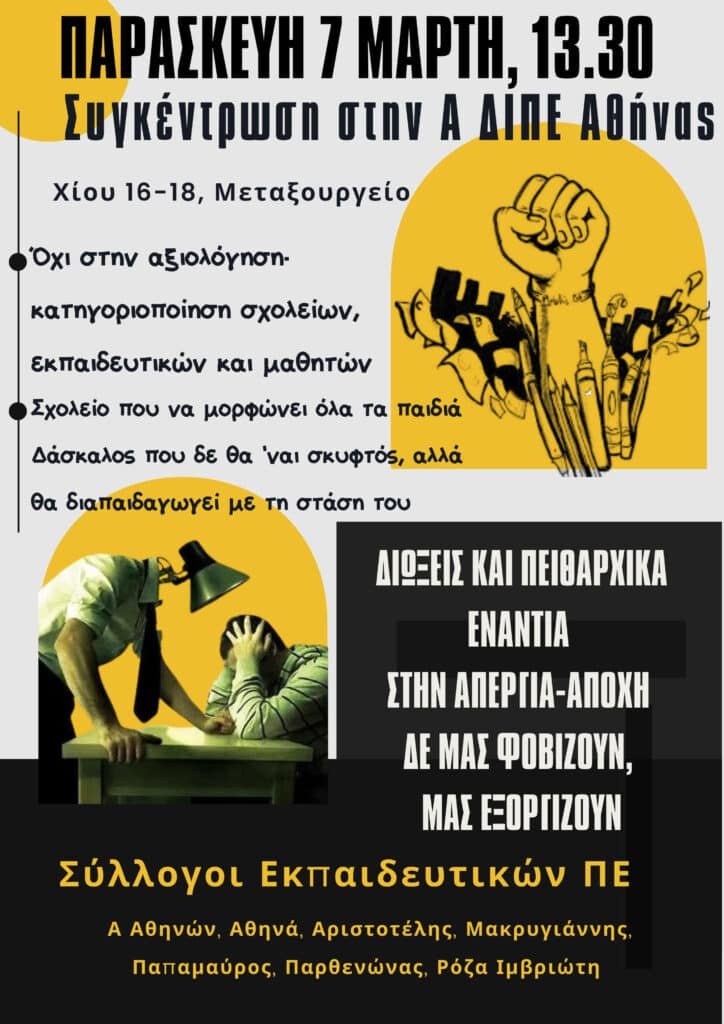 Όλες και όλοι στη νέα κινητοποίηση στη Διεύθυνση ΠΕ Α’ Αθήνας (Χίου 16-18) την Παρασκευή 7 Μάρτη, στις 13:30