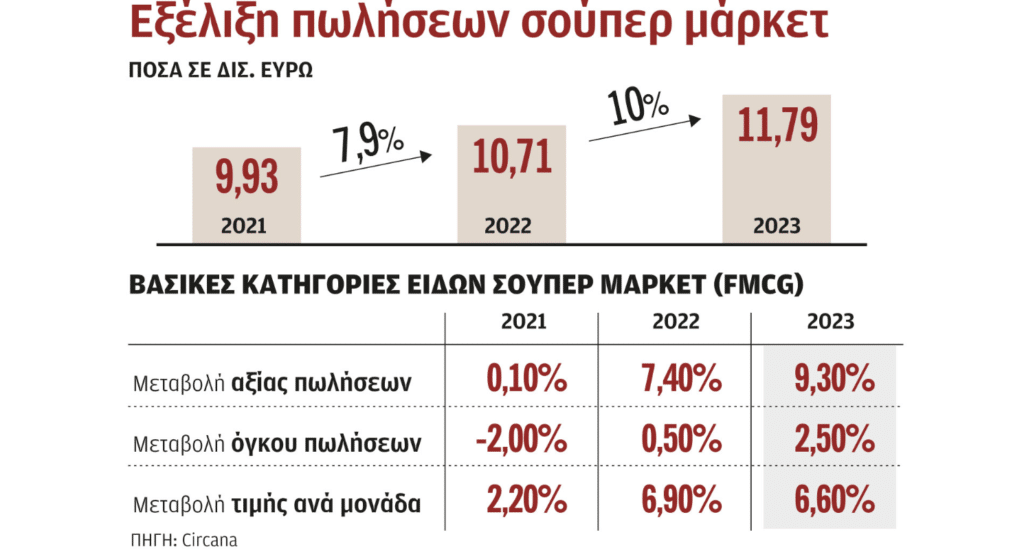 Σούπερ μάρκετ: Αύξηση τζίρου 1 δισ. ευρώ το 2023, αλλά ο όγκος πωλήσεων μόλις 2,5% λόγω ακρίβειας.