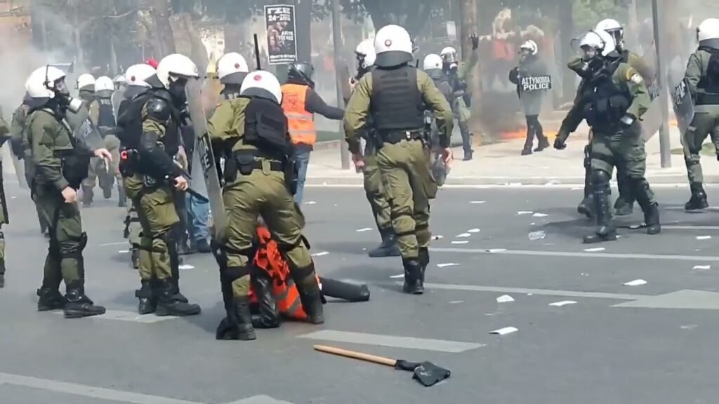 Έτσι τα ΜΑΤ διέλυσαν την μαζική ειρηνική απεργιακή διαδήλωση. Ο αρχηγός της διμοιρίας, δίνει εντολή και συντονισμένα μπλοκάρουν και χτυπούν το μπλοκ του σωματείου ΣΒΕΟΔ.