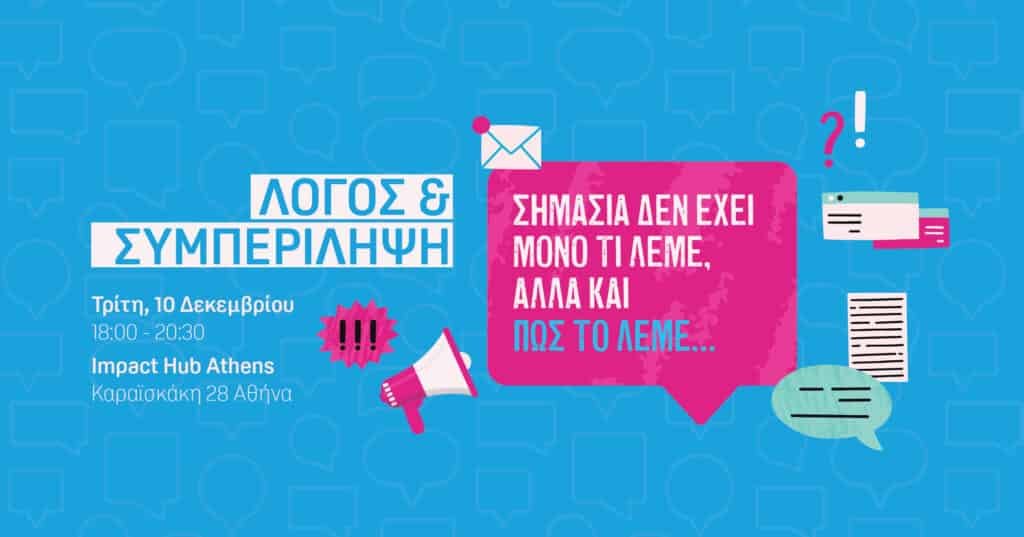 Το ΚΜΟΠ σας προσκαλεί σε μια διαδραστική εκδήλωση με τίτλο “Λόγος & Συμπερίληψη: Σημασία δεν έχει μόνο τι λέμε αλλά και πώς το λέμε”, την Τρίτη 10 Δεκεμβρίου, από τις 18:00 έως τις 20:30, στο Impact Hub Athens (Καραϊσκάκη 28, Αθήνα).