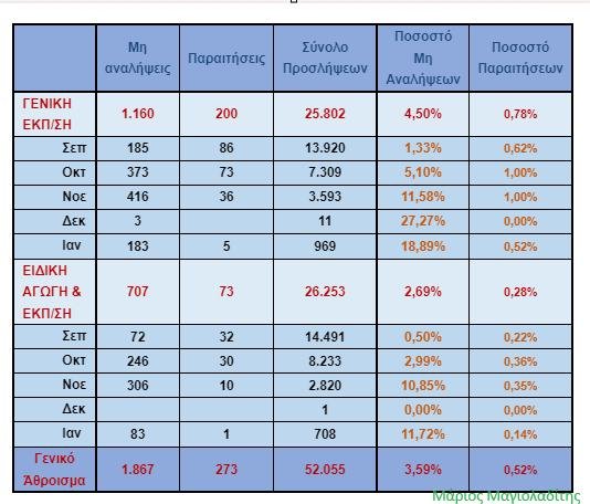 Σύνολο προσλήψεων, μη αναλήψεων και παραιτήσεων ανά μήνα για το τρέχον διδακτικό έτος 2023-2024 από επίσημα στοιχεία που έλαβα από το Υπουργείο Παιδείας
