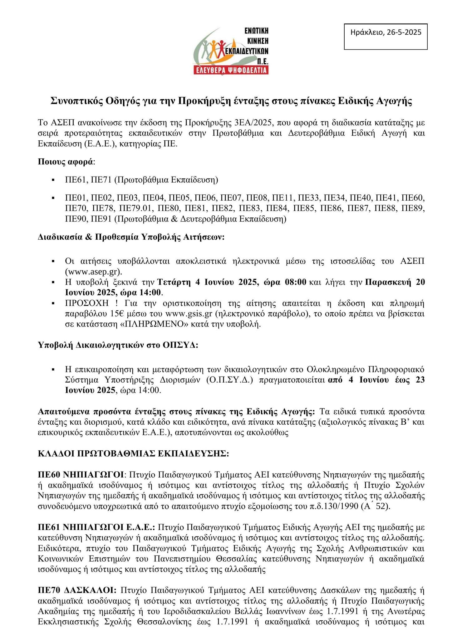 Ακολουθεί ένας συνοπτικός οδηγός για την προκήρυξη ένταξης στους πίνακες Ειδικής Αγωγής, που αφορά τους εκπαιδευτικούς που επιθυμούν να ενταχθούν ή να επικαιροποιήσουν τη θέση τους στους πίνακες ΑΣΕΠ Ειδικής Αγωγής: