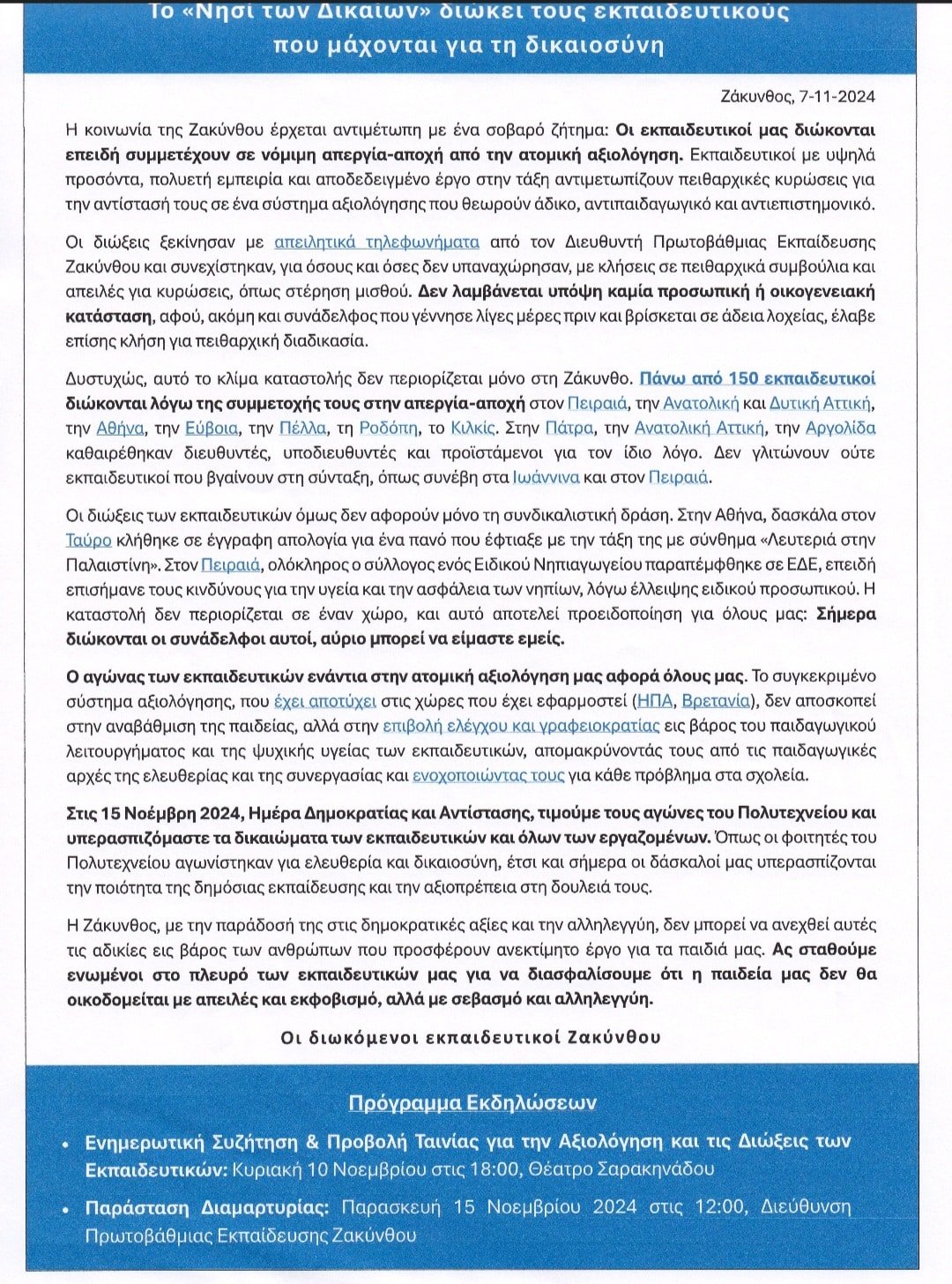 Η κοινωνία της Ζακύνθου έρχεται αντιμέτωπη με ένα σοβαρό ζήτημα: Οι εκπαιδευτικοί μας διώκονται επειδή συμμετέχουν σε νόμιμη απεργία-αποχή από την ατομική αξιολόγηση. Εκπαιδευτικοί με υψηλά προσόντα, πολυετή εμπειρία και αποδεδειγμένο έργο στην τάξη αντιμετωπίζουν πειθαρχικές κυρώσεις για την αντίστασή τους σε ένα σύστημα αξιολόγησης που θεωρούν άδικο, αντιπαιδαγωγικό και αντιεπιστημονικό. Οι διώξεις ξεκίνησαν με απειλητικά τηλεφωνήματα από τον Διευθυντή Πρωτοβάθμιας Εκπαίδευσης Ζακύνθου και συνεχίστηκαν, για όσους και όσες δεν υπαναχώρησαν, με κλήσεις σε πειθαρχικά συμβούλια και απειλές για κυρώσεις, όπως στέρηση μισθού. Δεν λαμβάνεται υπόψη καμία προσωπική ή οικογενειακή κατάσταση, αφού, ακόμη και συνάδελφος που γέννησε λίγες μέρες πριν και βρίσκεται σε άδεια λοχείας, έλαβε επίσης κλήση σε πειθαρχική διαδικασία. Δυστυχώς, αυτό το κλίμα καταστολής δεν περιορίζεται μόνο στη Ζάκυνθο. Πάνω από 150 εκπαιδευτικοί διώκονται λόγω της συμμετοχής τους στην απεργία-αποχή στον Πειραιά, την Ανατολική και Δυτική Αττική, την Αθήνα, την Εύβοια, την Πέλλα, τη Ροδόπη, το Κιλκίς. Στην Πάτρα, την Ανατολική Αττική, την Αργολίδα καθαιρέθηκαν διευθυντές, υποδιευθυντές και προϊστάμενοι για τον ίδιο λόγο. Δεν γλιτώνουν ούτε εκπαιδευτικοί που βγαίνουν στη σύνταξη, όπως συνέβη στα Ιωάννινα και στον Πειραιά.